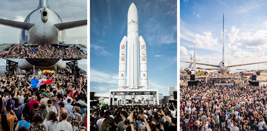 Ognuno dei tre stage del festival offrirà un’esperienza distinta: l’Ariane Stage ai piedi del razzo, l’A380 Stage sotto il più grande aereo passeggeri del mondo, e il Concorde Stage, incastonato tra le due icone supersoniche.