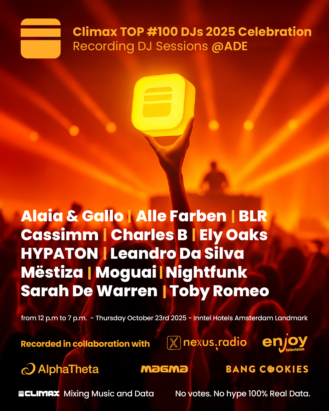 Per celebrare la classifica 2025, Climax ospiterà il Climax Recording DJ Sessions @ ADE il 23 ottobre presso l’Inntel Hotels Landmark Amsterdam, in collaborazione con Nexus Radio US e Enjoy TV.